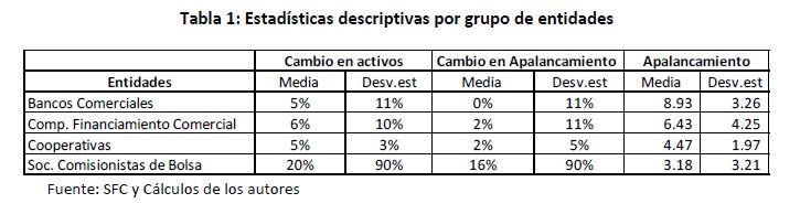 En este estudio calculamos un indicador de la actividad de shadow banking en Colombia para el período comprendido entre 01 de 2011 y 03 de 2013. Dicho indicador sugiere que esta actividad ha venido incrementándose y representa cerca del 9,9% del PIB de 2012. Adicionalmente, evaluamos el nivel de prociclicidad que puede tener la decisión de apalancamiento de un grupo de intermediarios financieros especialmente asociados a este tipo de actividad, encontrando que dicha prociclicidad está asociada a un 05r uso de operaciones repo y de simultáneas por parte de los intermediarios financieros. Finalmente, a través de la adaptación de un modelo teórico de liquidez y apalancamiento (Tirole, 2011) planteamos bajo qué condiciones dichas decisiones de apalancamiento se tornan procíciclicas.