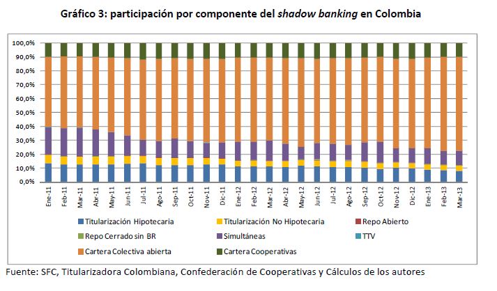 In this study we calculate an indicator of the shadow banking activity in Colombia for the period between January 2011 and March 2013. This indicator suggests that this activity has been increasing, accounting for about 9.9% of GDP in 2012. Additionally,