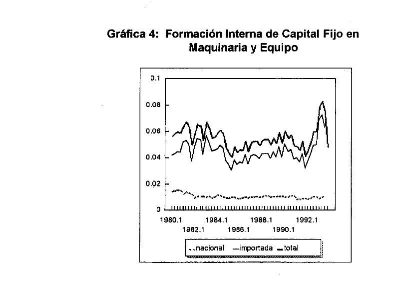 Infortunadamente, esta falta de dinamismo parece ser una descripción bastante exacta de la inversión privada en Colombia durante las últimas décadas (1). En general las explicaciones para esta característica de la economía Colombiana han enfatizado la hipótesis del acelerador. Los resultados han sido ambiguos, con algunos trabajos encontrando una relación positiva entre variables de demanda e inversión (por ejemplo, Chica 1984 y 1988; Ocampo et al. 1988). Sin embargo, Fainboim (1990) concluye que aunque puede ser contemporánea, esta relación no se mantiene en el largo plazo. Otras variables que se muestran generalmente significativas en determinar la tasa de inversión son el efecto negativo del precio relativo del capital, tradicionalmente alto en Colombia, la disponibilidad de divisas y de recursos internos y la tasa de cambio real (Cárdenas, 1996; Cárdenas y Olivera 1995; Ocampo et al. 1988; Reyes 1978). Pocos estudios incluyen la tasa de interés entre las variables que puedan incidir en la inversión, y cuando se ha incluido, los resultados han sido ambiguos (Cárdenas y Olivera, 1995; Echeverry, 1993; Fainboim, 1990).