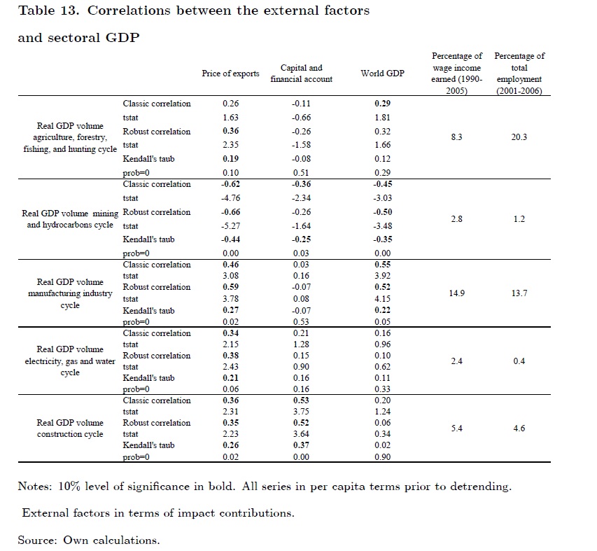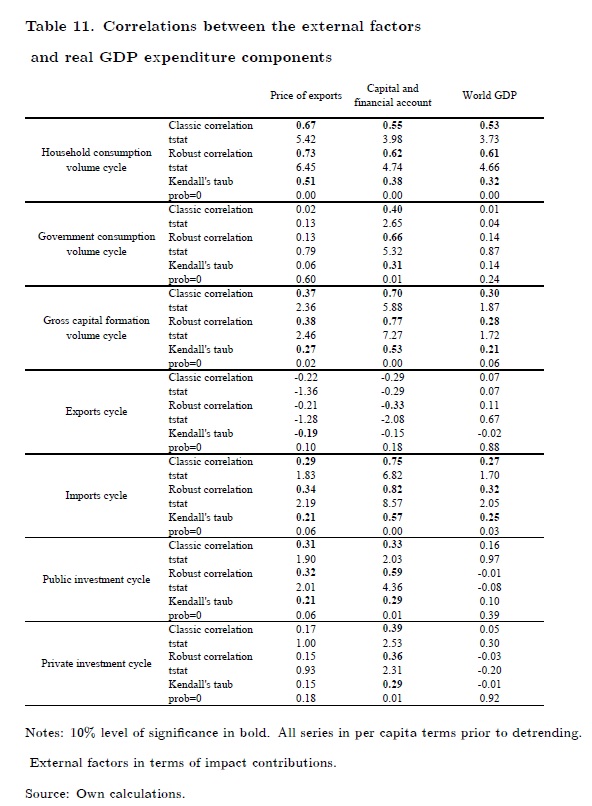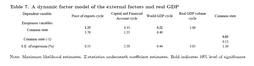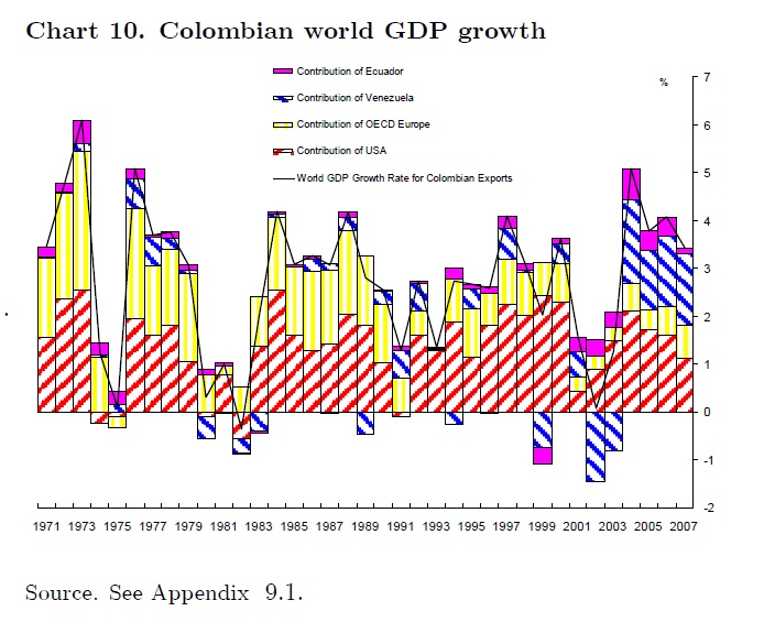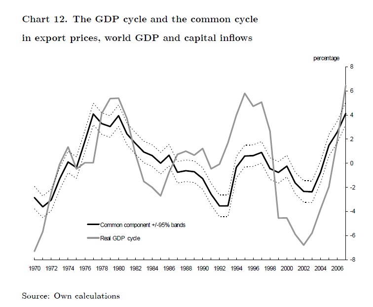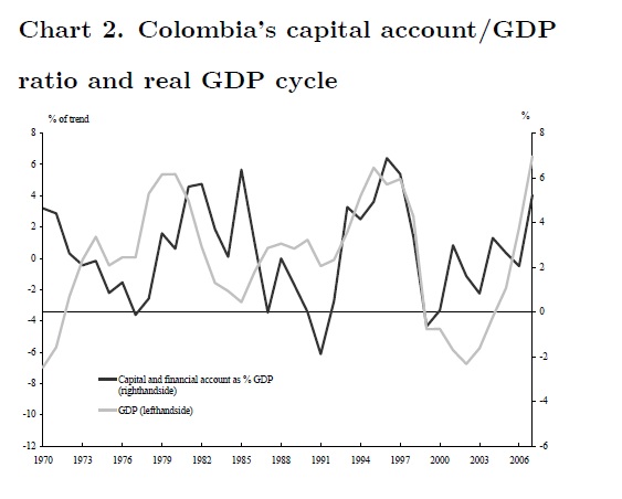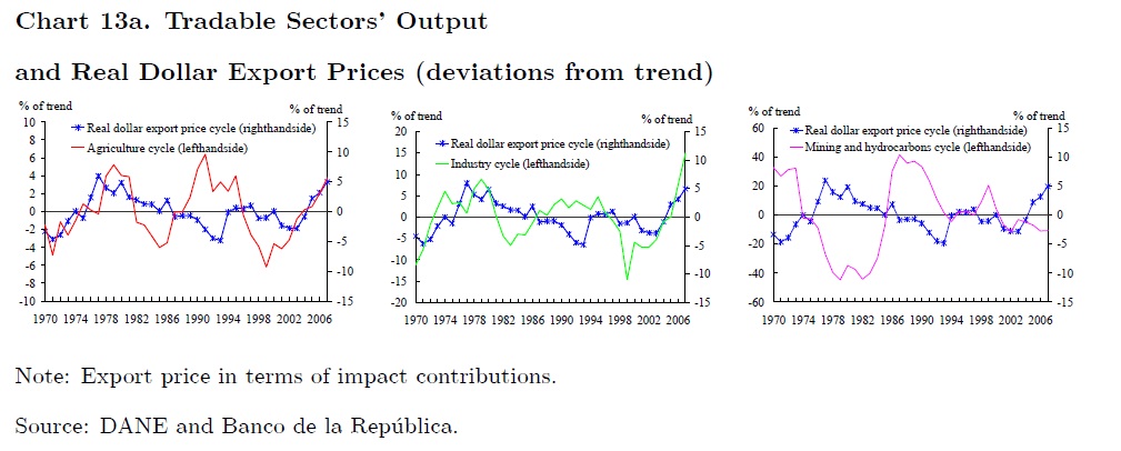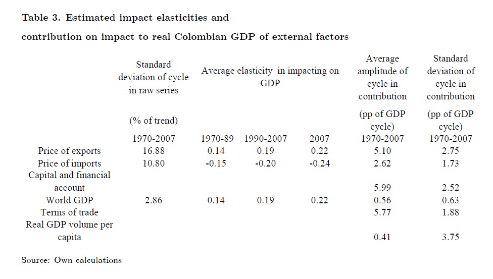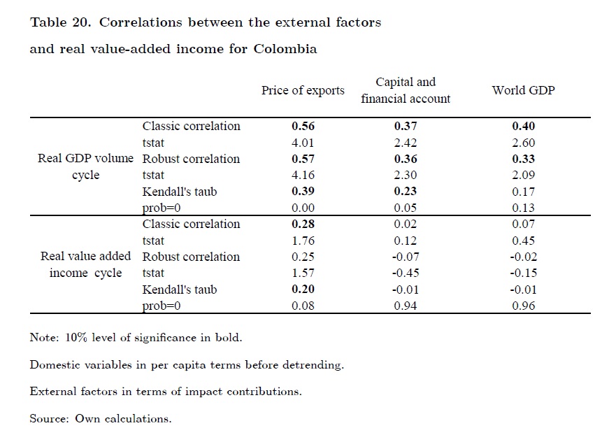 The objective of this paper is to analyze how international cycles affect the real GDP cycle and so monetary policy decisions in Colombia. We estimate that cycles in world GDP, export prices and capital inflows are strongly associated with the Colombian b