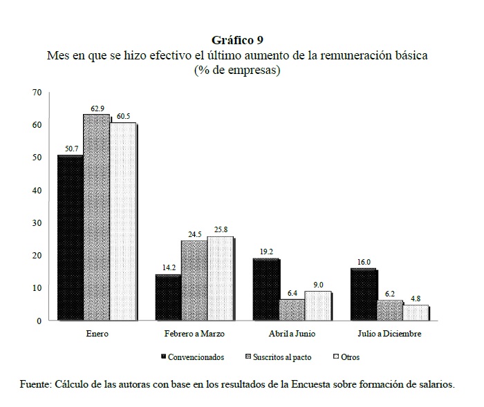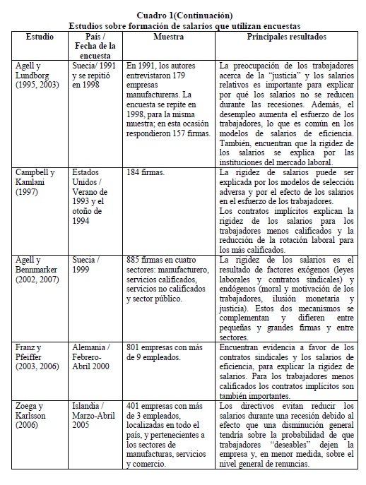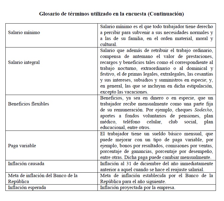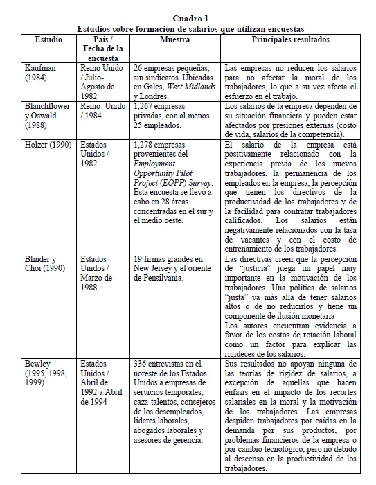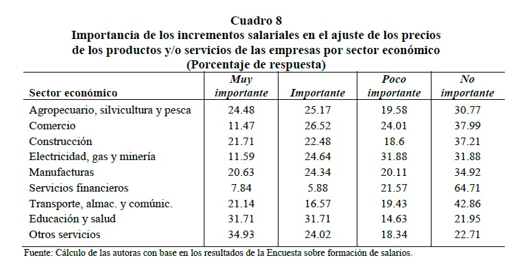 Este estudio explora los mecanismos de fijación e incremento de los salarios, analiza la naturaleza y las fuentes de sus rigideces y evalúa el vínculo entre los cambios en los salarios y la variación de los precios de los bienes y/o servicios de las empresas, a partir de una encuesta a 1,305 firmas colombianas. Los resultados indican que los incrementos salariales son tiempo-dependientes y que la situación financiera de la empresa, su productividad, el desempeño de los trabajadores y la inflación causada son los factores más importantes en el momento de definir los ajustes salariales. Adicionalmente, los resultados de la encuesta apoyan la presencia de rigideces nominales y reales de los salarios a la baja en Colombia y se encuentra que las razones más importante para no reducir la remuneración básica de los trabajadores, en época de difícil situación económica, están asociadas con la teoría de salarios de eficiencia.