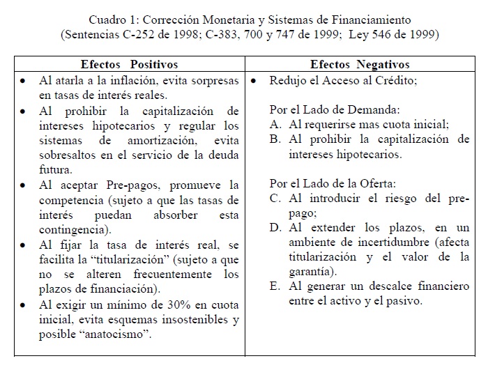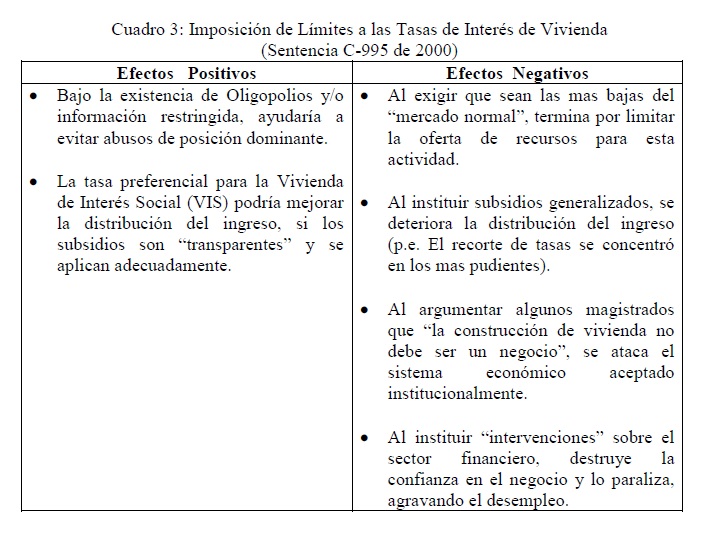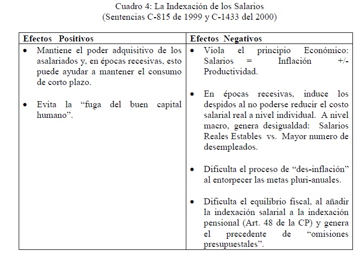 El desarrollo económico y social en Colombia está amenazado, entre otros factores, por la "inestabilidad jurídica", agravada ahora por el activismo de la Corte Constitucional durante los años 1994-2000. En este documento se ilustran los efectos económicos mas profundos que habrán de tener algunos de sus fallos. Argumentamos que el común denominador de los errores económicos de la Corte está en el detrimento de la distribución del ingreso, al usar criterios de supuesta igualdad, para casos que requerían tratamientos diferenciales. Este ha sido el caso de la reliquidación de los alivios hipotecarios, los controles permanentes a las tasas de interés en dichos créditos y la indexación de los salarios. Adicionalmente, estos fallos en materia salarial tornarán mas difícil la lucha contra la inflación, afectando negativamente la inversión y la generación de empleo. No solo por el respeto a la separación de poderes, sino porque es lo que le conviene al crecimiento de largo plazo del país, concluimos que deberían primar, como en los países desarrollados, los arreglos institucionales a través de los cuales las discrepancias en materia económica se dirimen, por excelencia, en el Congreso de la República.