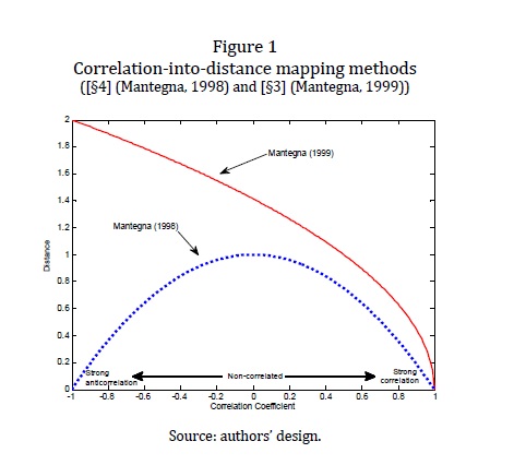 Since correlation may be interpreted as a measure of the influence across time-series, it may be conveniently mapped into a distance and into a weighted adjacency matrix. Based on such matrix, network theory has attempted to filter out the noise in correl