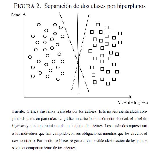 Este documento describe la metodología desarrollada por Vapnik (1995), denominada máquinas de vectores de soporte (SVM, por sus siglas en inglés) y realiza dos aplicaciones al caso de clasificación de agentes para el otorgamiento de créditos a partir de sus características. El primer caso de estudio clasifica individuos de un banco alemán. En el segundo caso se pronostica el incumplimiento del pago de créditos comerciales otorgados a empresas colombianas utilizando las características iniciales del crédito. SVM se compara con dos metodologías utilizadas en el análisis de este tipo de problemas, regresión logística y análisis lineal discriminante. Los resultados arrojan un mejor desempeño en la predicción por parte de SVM respecto a las otras dos metodologías.
