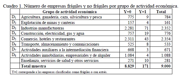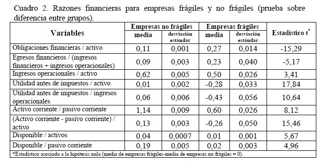 Una de las 05res amenazas para toda empresa es caer en un estado de insolvencia. Este tipo de amenaza a la estabilidad financiera de las empresas es relevante no solo para inversionistas y empleados, sino también para prestamistas del sector financiero, auditores y autoridades reguladoras entre otros. Usando técnicas de regresión probit este estudio desarrolla un modelo en que se identifican las variables relevantes para pronosticar el estrés o fragilidad financiera de las empresas en Colombia en el año 2001. A partir de los estados financieros que 9000 empresas reportaron en el año 2000, el modelo identificó correctamente al 82% de las empresas frágiles y no frágiles. Los resultados confirman la importancia de los indicadores de rentabilidad, endeudamiento y liquidez en la solvencia presentada por las empresas, puntualmente la utilidad antes de impuestos sobre activo, obligaciones financieras sobre activo y disponible sobre activo respectivamente.
