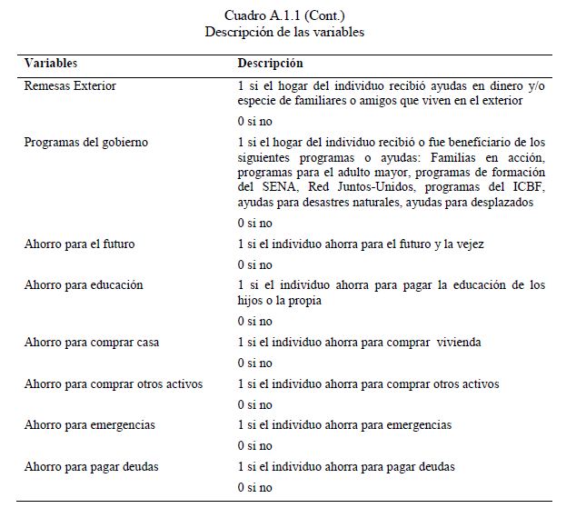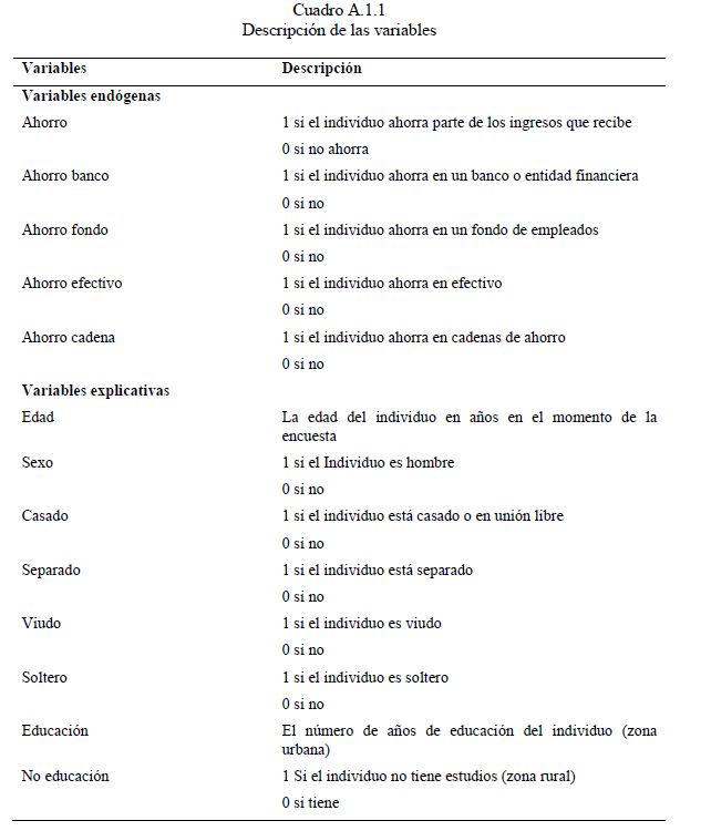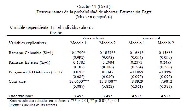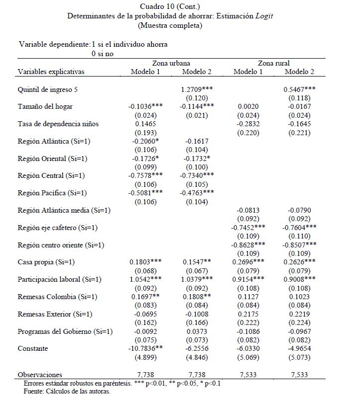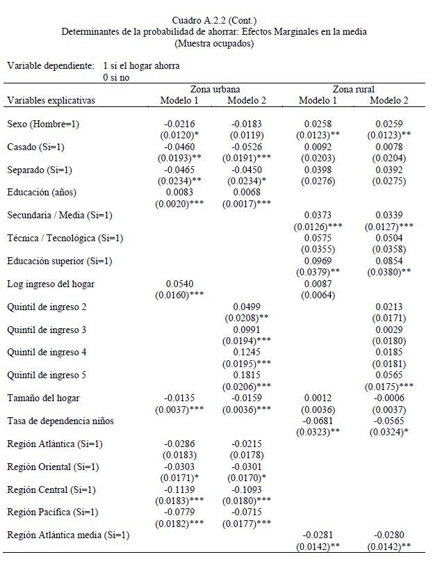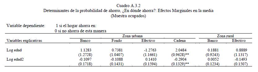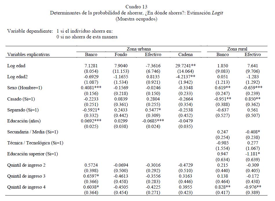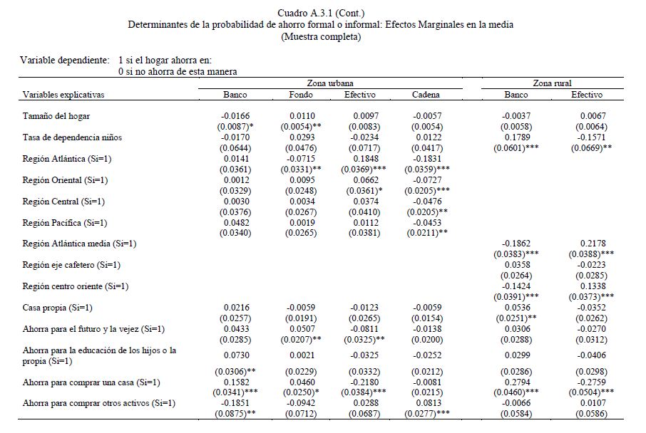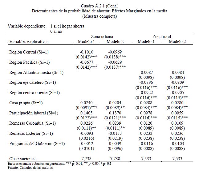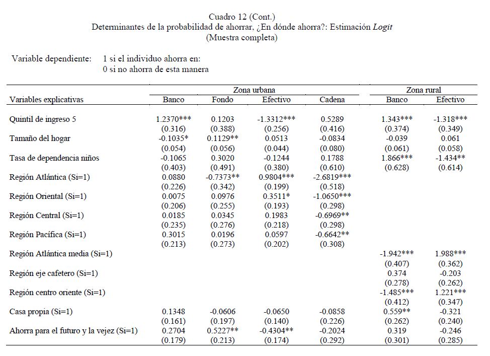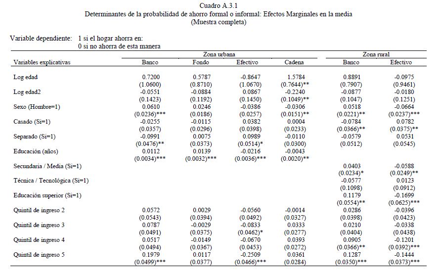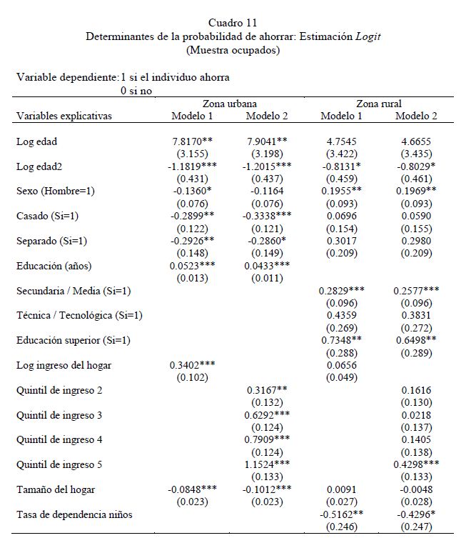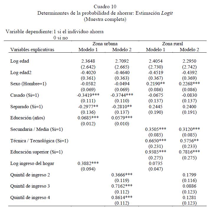 Este documento analiza empíricamente el ahorro de los hogares de ingresos medios y bajos de las zonas urbana y rural en Colombia, utilizando información de la Encuesta Longitudinal Colombiana de la Universidad de los Andes. Los resultados muestran una relación positiva entre el ingreso y el ahorro de los hogares. Además, se encuentra que la probabilidad de ahorrar aumenta con el nivel educativo, el ingreso, la participación laboral y la tenencia de vivienda del individuo. De otro lado, los resultados indican que la educación, el ingreso y una situación laboral estable aumentan la probabilidad de ahorrar en bancos y fondos de empleados o cooperativas y disminuyen la probabilidad de ahorrar de manera informal.