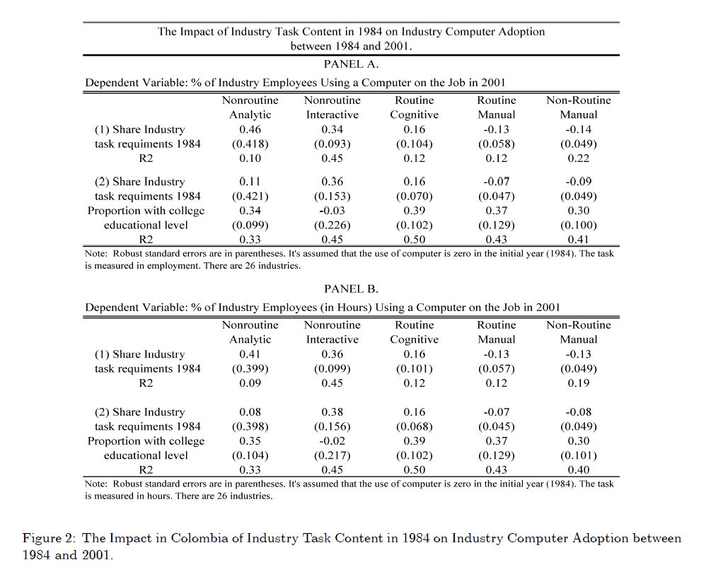 | dc.description.abstract | We use occupations descriptions for Brazil, Colombia and Mexico, to build computer-use related tasks intensities, and link then to series of cross sections of data of each country in order to empirically assess to what extent the observed empirical regula | eng |