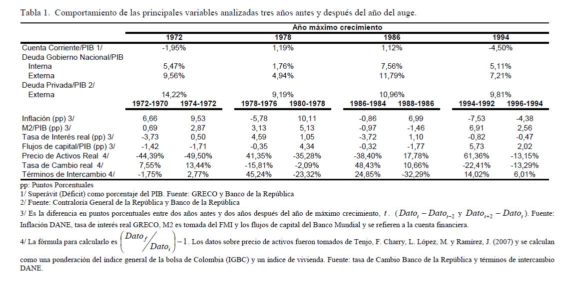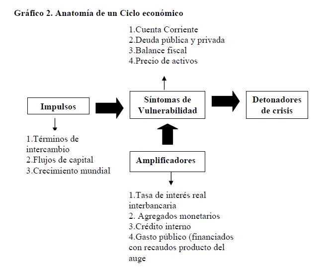 Este documento analiza los cuatro ciclos completos económicos que se presentaron en Colombia desde 1970. Se logró identificar que los cambios en factores externos, como lo son las mejoras en los términos de intercambio y flujos de capital, han sido impulsadores de los auges. Adicionalmente, como principal objetivo, muestra la responsabilidad que han tenido factores y políticas internas en el desarrollo de los ciclos. Estos han sido amplificadores del impulso externo inicial convirtiéndolo en auges insostenibles que llevan a la economía a condiciones vulnerables. Por lo tanto, los factores que fueron inicialmente impulsos del crecimiento se convierten en detonadores de la crisis.