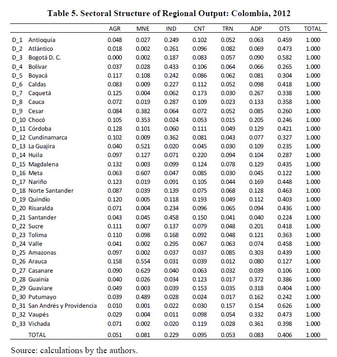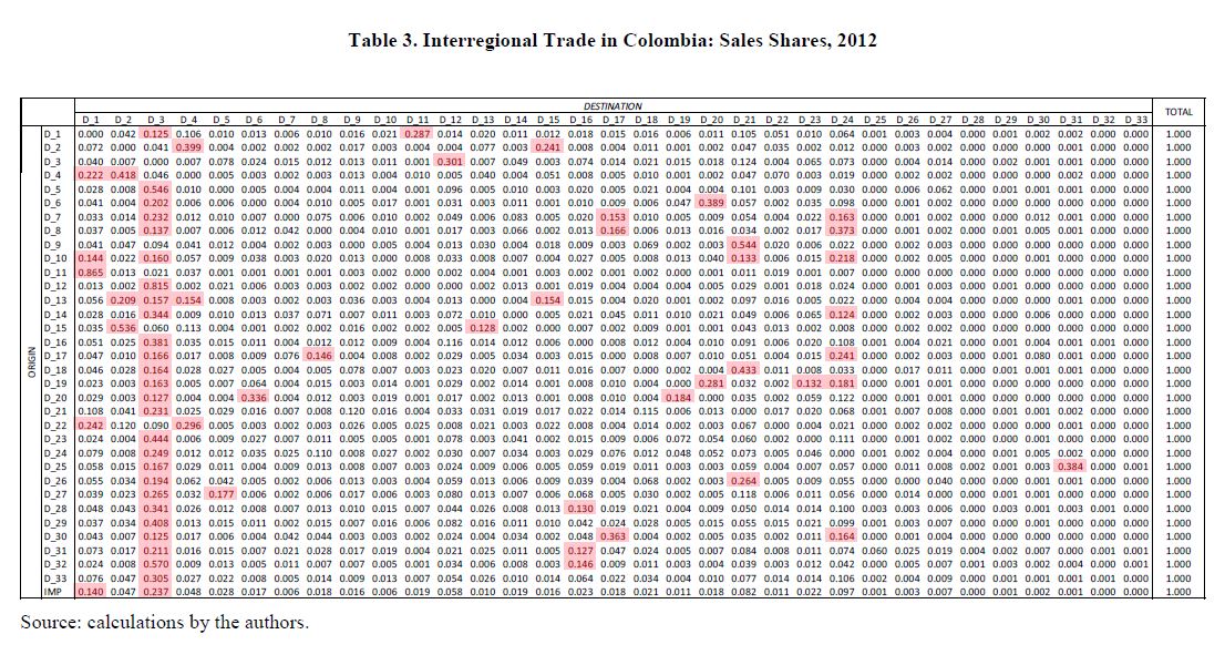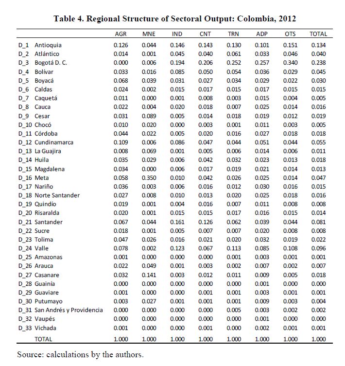 Interregional input-output matrix for Colombia, 2012