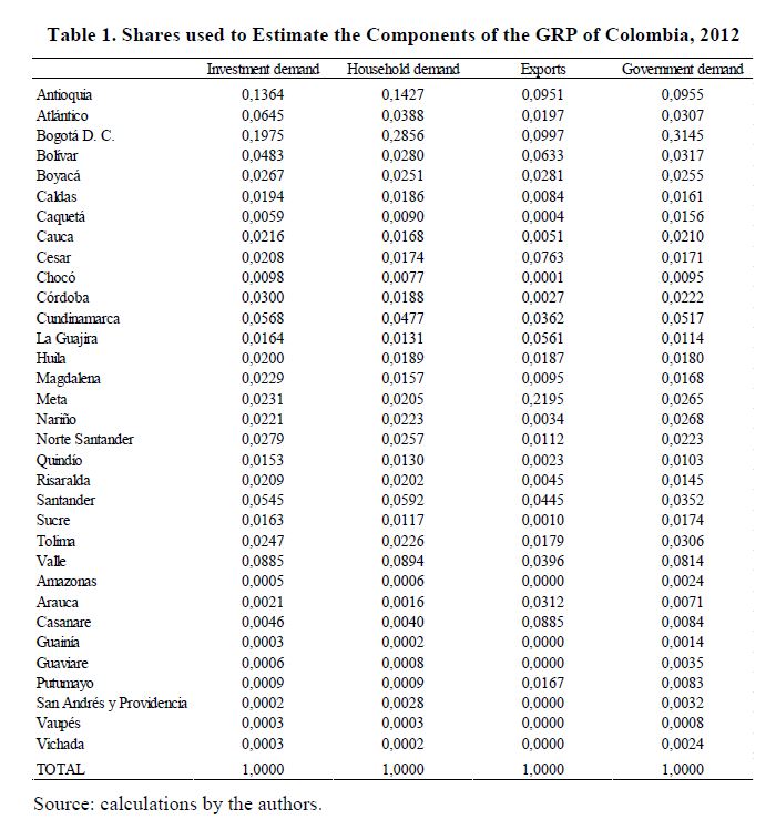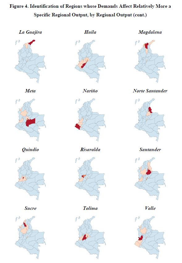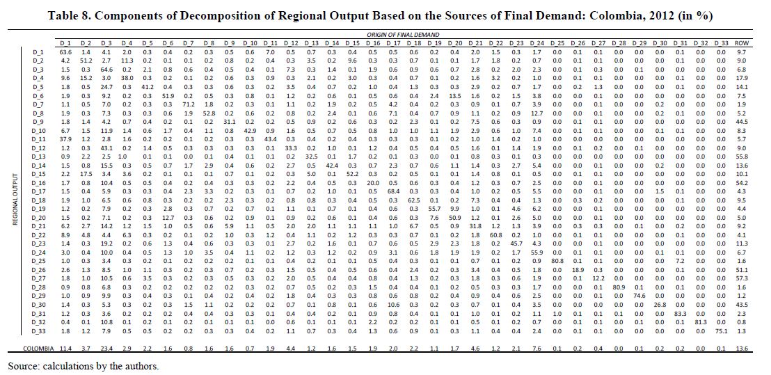El presente documento presenta un breve resumen de los principales aspectos asociados a la construcción de una matriz de insumo-producto interregional para Colombia. Como parte de un proyecto en curso que tiene como objetivo actualizar un modelo interregional CGE (ICGE) para el país, el modelo CEER, se construyó una base de datos para estimar un modelo de insumo-producto interregional completamente especificado, bajo condiciones de información limitada. Dicha base de datos se requiere para una futura calibración del modelo ICGE. Se lleva a cabo un análisis de las participaciones intra e interregionales de los multiplicadores medios de producto. Por otra parte, también se muestran algunas cifras detalladas sobre la descomposición del producto, teniendo en cuenta la estructura de la demanda final.