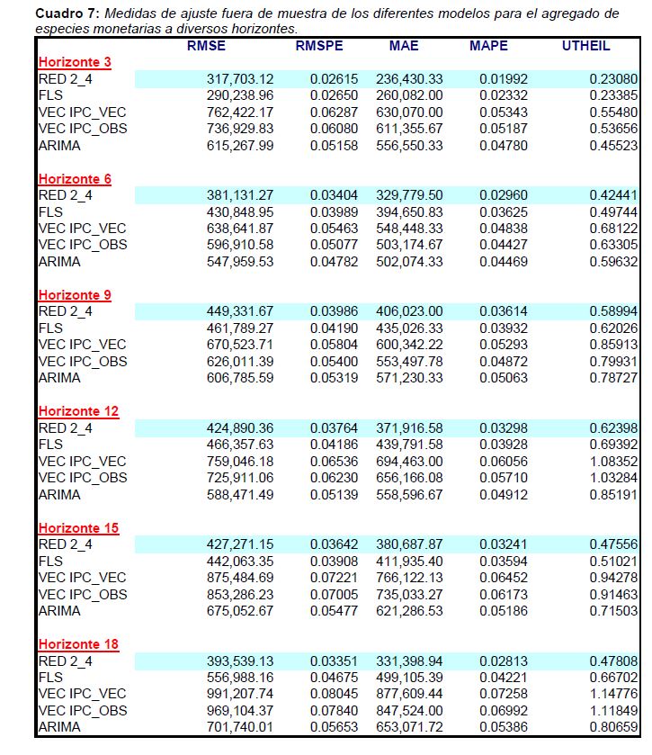 | dc.description | Las tesorerías de los Bancos Centrales enfrentan el problema de pronosticar las necesidades de especies monetarias requeridas por los agentes económicos para finalizar sus transacciones. Dichos pronósticos son utilizados para hacer sus planes a mediano plazo (2 a 3 años en el caso colombiano) de producción, e inventarios de materia prima y unidades terminadas por denominación. El objetivo de este trabajo es evaluar distintas técnicas de pronóstico que sean lo suficientemente flexibles como para incorporar las innovaciones recientes en los determinantes de la demanda y la estructura denominacional de las especies monetarias, y reconocer las posibles no-linealidades en la relación de aquellos con el uso del efectivo. La estrategia seguida se basa en la utilización de redes neuronales artificiales (ANN) y mínimos cuadrados flexibles (FLS), dos técnicas econométricas bastante robustas frente a cambios estructurales y que permiten incorporar elementos no-lineales en la modelación del efectivo. | spa |