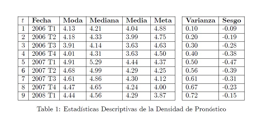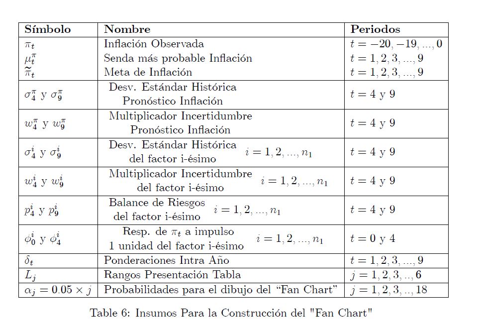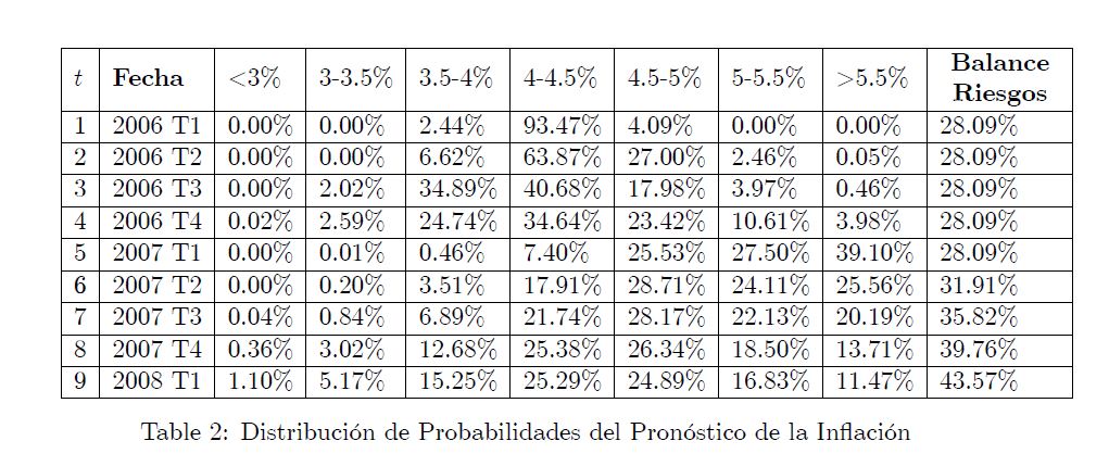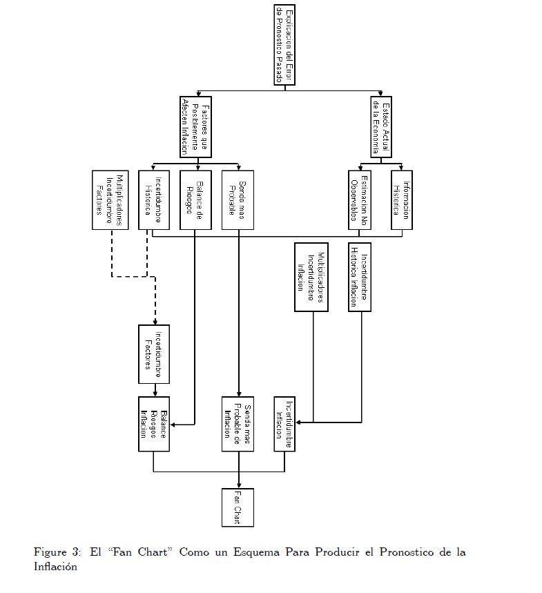El "Fan Chart" representa la función de probabilidades de los valores futuros de una variable, condicional a la información conocida en el presente. En contraste con la tradicional senda de pronósticos puntuales y sus bandas confidenciales simétricas, el Fan Chart presenta dos ventajas: Primero, describe completamente la densidad marginal de pronóstico en cada uno de los períodos del horizonte. Y segundo, su formulación permite que la densidad marginal de pronóstico sea asimétrica. Cuando esta densidad no es simétrica, la probabilidad (o riesgo) de que el valor futuro de la variable asuma valores por encima de la senda central de pronóstico es diferente a la de que asuma valores por debajo de dicha senda. Esta característica lo hace muy deseable para representar los riesgos de que se cumplan metas sobre el valor futuro de la variable en cuestión. En el caso del Informe de Inflación el "Fan Chart" cumple con dos objetivos: Primero, comunicar al público las previsiones de la autoridad monetaria sobre la evolución futura de la inflación con base en el "mejor conocimiento" actual de la economía, propósito relacionado con la transparencia del esquema de inflación objetivo y con la credibilidad de las políticas para alcanzar dichas metas. Y segundo, organizar la forma como la autoridad monetaria aborda el problema de pronosticar la inflación, lo cual tiene que ver con el desarrollo del informe sobre inflación y su distribución temática. En esta nota se describe en detalle la implementación acutal del "Fan Chart" que utiliza el Banco de la República para su Informe sobre inflación, se presenta un ejemplo que ilustra su adecuada utilización, se describe la manera como este se debe interpretar y se describe el uso de un programa que facilita su aplicación. Con esto, se persigue explicitar el uso e interpretación del "Fan Chart".