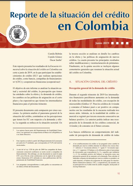 Este reporte presenta los resultados de la Encuesta trimestral sobre la situación del crédito en Colombia con corte a junio de 2019, en la que participan los establecimientos de crédito (EC) que realizan operaciones de crédito, como bancos, compañías de financiamiento (CFC) y cooperativas financieras (cooperativas) . El objetivo de este informe es analizar la situación actual y sectorial del crédito, la percepción que tienen las entidades sobre la oferta y la demanda de crédito, los cambios en las políticas de asignación en el corto plazo y las expectativas que tienen los intermediarios financieros para el próximo trimestre. El presente documento está compuesto por cinco secciones. La primera analiza el panorama general de la situación del crédito, centrándose en las percepciones que tienen los EC con respecto a la demanda y oferta. La segunda se enfoca en la situación sectorial. En la tercera sección se analizan en detalle los cambios en la oferta y las políticas de asignación de nuevos créditos. La cuarta presenta los principales resultados sobre modificaciones y reestructuración de préstamos. Finalmente, en la quinta sección se incluyen algunos comentarios generales que resumen la situación actual del crédito en Colombia.