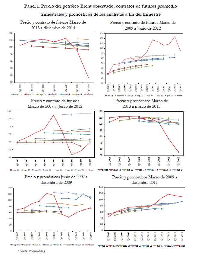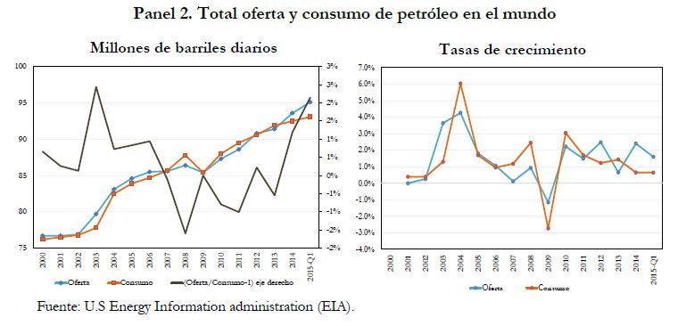 La economía colombiana se ha visto impactada por la fuerte caída en la cotización internacional del petróleo, la cual se caracterizó por ser sorpresiva, acelerada y de magnitud considerable. Según los analistas, este choque podría ser persistente y extenderse por varios años. Sumado a lo anterior, el volumen de producción de hidrocarburos en el territorio nacional también podría caer, como resultado de la menor inversión en el sector ante los bajos precios del crudo. El presente documento hace un análisis descriptivo del choque petrolero reciente y de sus determinantes, así como de sus implicaciones para la economía colombiana. A la fecha, el desplome de los precios ha afectado los términos de intercambio del país y con ello el ingreso nacional, impactando las cuentas externas y la tasa de cambio, las finanzas públicas, la confianza de los mercados y el riesgo país. Lo anterior se ha traducido en una significativa desaceleración de la actividad económica. La respuesta de política económica ha sido coherente con un sólido marco institucional previamente establecido, que ha propiciado un ajuste ordenado de la economía a las nuevas circunstancias externas. Entre las características más importantes de dicho marco de política se destacan un régimen de inflación objetivo con flexibilidad cambiaria, una regla fiscal para el Gobierno Nacional y una política macro-prudencial que aboga por la estabilidad financiera.