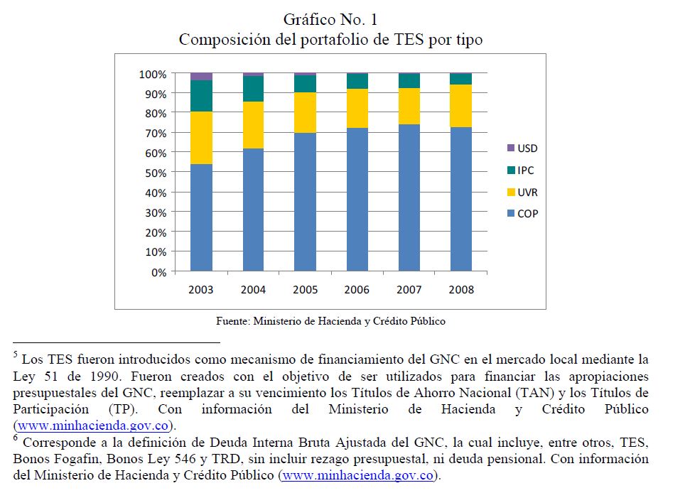 Los mercados de títulos soberanos cumplen varias funciones para los mercados de capitales. Son fuente de financiación para el gobierno que los emite, cumplen el rol de activo libre de riesgo -de crédito- del mercado, al tiempo que sirven como referencia o benchmark para las diferentes alternativas de inversión del mercado. En el caso colombiano es claro que los Títulos de Tesorería (TES) cumplen las dos primeras funciones, pero se reconoce que aún es limitada su utilidad como benchmark del mercado local. La práctica internacional demuestra que el desarrollo de índices representativos del mercado de deuda pública permite contar con un benchmark apropiado. Con tales índices se consigue una serie de precios que sobrevive al vencimiento de los títulos, que permite hacer comparaciones en el largo plazo, y que permite capturar de mejor manera la dinámica del mercado. La práctica sobre benchmarks en Colombia consiste en una simple comparación con uno o dos títulos en particular, los más líquidos del mercado en un momento en el tiempo, lo cual representa serias limitaciones técnicas y analíticas. Así mismo, existen índices cuya metodología los hace poco aptos para cumplir función de benchmark del mercado de deuda pública local. Por lo tanto, basado en la práctica internacional y con el fin de realizar un aporte inicial en el desarrollo de metodologías que permitan contar con un benchmark para el mercado local, este documento desarrolla y presenta el índice IDXTES.