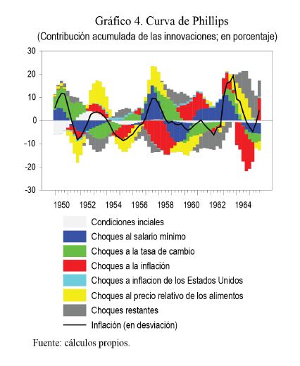 El artículo estudia la in?ación en Colombia durante 1951?1963 de acuerdo al enfoque de presión de costos (cost push in?ation). El artículo propone un modelo en el que la in?ación responde a los aumentos salariales, la devaluación y la in?ación de alimentos. El modelo incorpora una ecuación para la in?ación de alimentos en función del fenómeno El Niño-Oscilación del Sur. Entre los resultados se argumenta que los ajustes masivos en los salarios y la tasa de cambio actuaron como importantes fuerzas expansivas de la in?ación durante los programas de estabilización y como fuerzas contractivas de la misma durante los prolongados períodos comprendidos entre los ajustes. Los choques de oferta de alimentos desempeñaron un papel importante en la evolución de la in?ación en el corto plazo. El análisis lleva a dos principales implicaciones de política. Primero, la evolución de la in?ación en el corto plazo ha sido atribuida por la literatura a los cambios en el crecimiento del dinero, pero el enfoque de in?ación de costos ofrece importantes puntos de vista sobre la evolución de la in?ación en el corto plazo. Segundo, Colombia no llegó a la hiperin?ación porque no persistió en el objetivo de aumentar los salarios reales. En vez de esto, permitió aumentos de precios y renunció a regla de indexación de los salarios. En consecuencia la in?ación se mantuvo ?exible y bajó rápidamente.