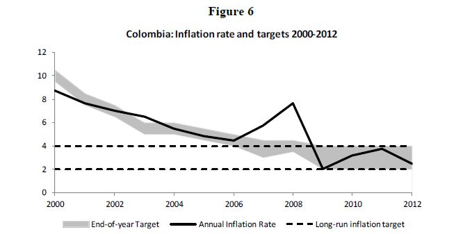 After decades using monetary aggregates as the main instrument of monetary policy and having different varieties of crawling peg exchange rate regimes, Colombia adopted a full-fledged inflation-targeting (IT) regime in 1999, with inflation as the nominal