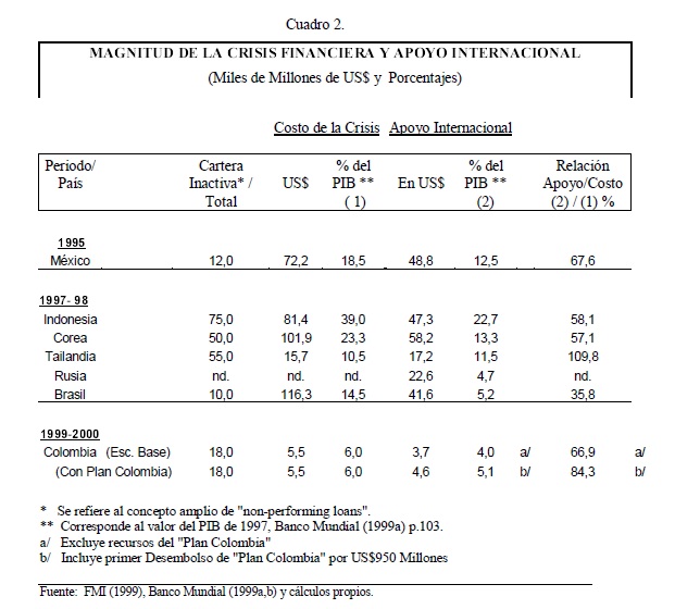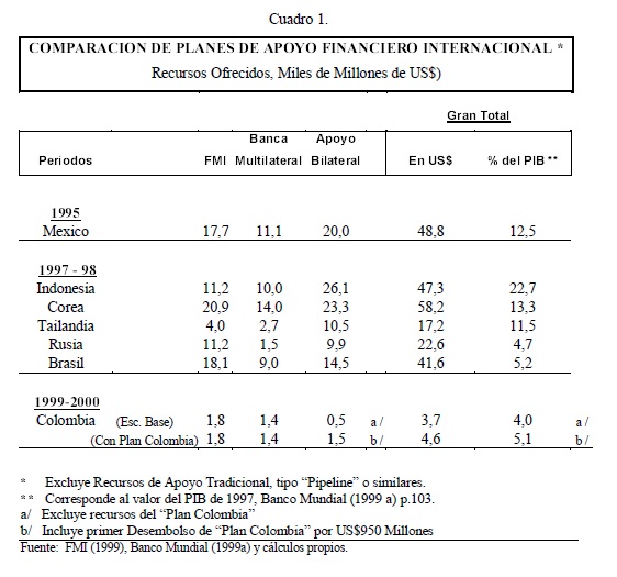 En este documento se analiza, desde la óptica de un país usuario de los recursos de las multilaterales (FMI-Banco Mundial), el proceso de exigencias a estos organismos y las respuestas macroeconómicas que finalmente dieron durante el reciente periodo de crisis internacional (1997-2000). Destacamos, en particular, la magnitud relativa del apoyo financiero que recibió Colombia, incluido el efecto del llamado “Plan Colombia” y se compara con las ayudas recibidas por México (1994-95) y por otros países Asiáticos, Rusia y Brasil. También se ponen en perspectiva histórica los esfuerzos de estas instituciones por construir una “nueva arquitectura financiera” que permita amortiguar los efectos de las crisis financieras. Las 05res exigencias radican en la creación de nuevos estándares de supervisión y en acelerar los programas de recapitalización bancaria y de reestructuración de las deudas empresariales.