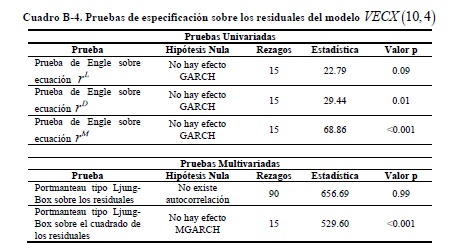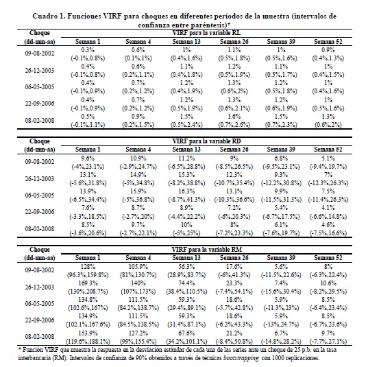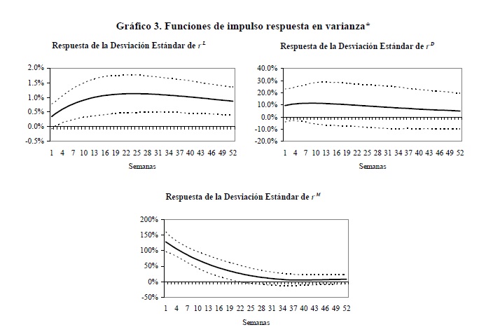 Este documento busca describir la dinámica de la transmisión de las medidas de política monetaria implementadas por el Banco de la República hacia las demás tasas de interés, con el fin de identificar la efectividad y el rezago que tienen las medidas de política monetaria. A partir de un modelo teórico donde se plantean las principales relaciones entre las tasas de interés a las cuales captan y ofrecen recursos los bancos comerciales, sumadas con algunas consideraciones relacionadas con el esquema de metas de inflación, se plantea un modelo VECX-MGARCH, el cual no sólo permite analizar las interacciones entre los niveles de las tasas de interés, sino que, además, modela las relaciones entre las volatilidades de las variables endógenas del modelo. En general, los resultados sugieren que la dinámica que exhibe el esquema de transmisión de política monetaria a través de las tasas de interés opera de acuerdo a lo esperado según el esquema de metas de inflación. En efecto, el modelo VECX-MGARCH respalda las implicaciones del modelo teórico y, adicionalmente, los análisis derivados de las funciones de impulso respuesta (en media y varianza) sugieren que el efecto de un choque monetario sobre las tasas de interés siguen de cerca los objetivos planteados por el banco central, tanto en signo como en magnitud.