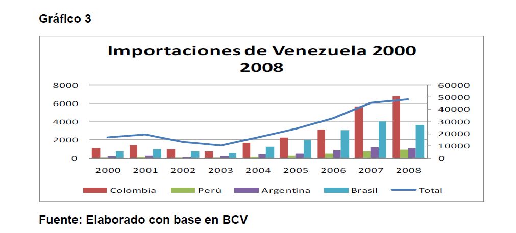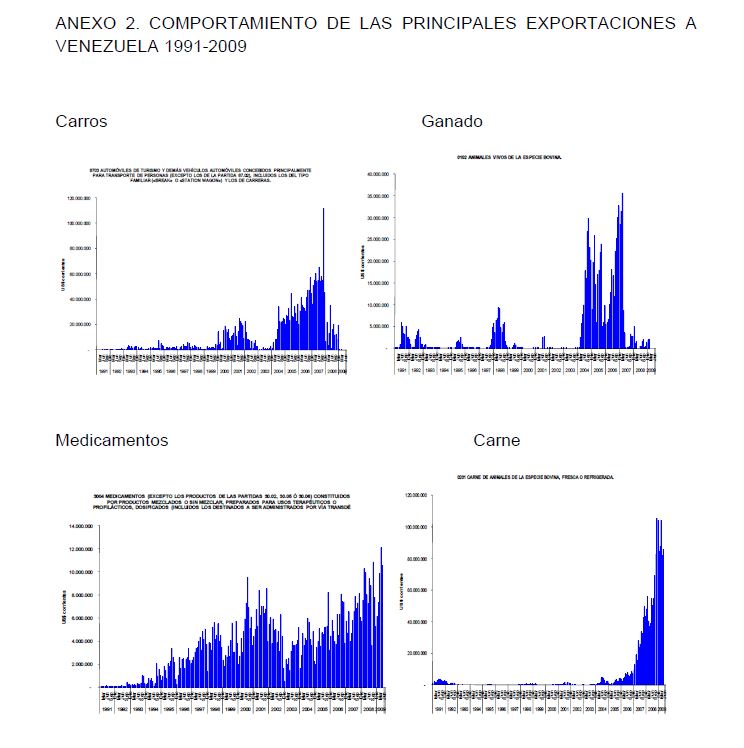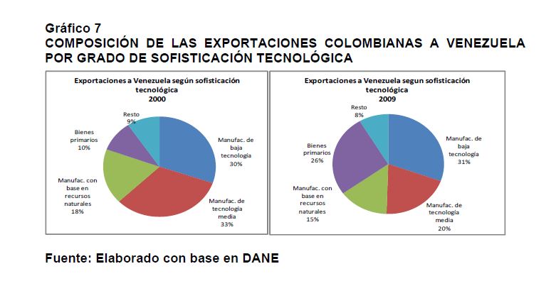 El comercio colombo-venezolano ha experimentado desde los años setenta varias fases de auge y crisis, pero su etapa de crecimiento más importante fue la registrada entre 2004 y 2009. Este crecimiento del comercio se dio en respuesta de una serie de políticas y acontecimientos económicos a ambos lados de la frontera. En Venezuela, fueron determinantes las políticas del Presidente Chávez que han llevado a una transformación productiva de Venezuela y la burbuja de consumo experimentada por el auge de los precios del petróleo. En el caso de Colombia, no debe despreciarse el papel que han tenido las políticas económicas que, sin que sea totalmente evidente, han privilegiado la producción de bienes de consumo a través de 05r protección efectiva mediante aranceles altos. Fueron estas políticas que también permitieron que el desarrollo del comercio bilateral en este último período fuera un proceso de más "desviación" que "creación" de comercio. Esto hace que la sustitución de mercados que Colombia requiere para disminuir su dependencia no sea fácil e inmediata. El impacto final de la caída del comercio con Venezuela en el largo plazo sería de una pérdida de exportaciones reales para Colombia de 3,08% y del PIB de 1,01. En Venezuela, por su parte los impactos sobre las ventas y el PIB serían 05res.
