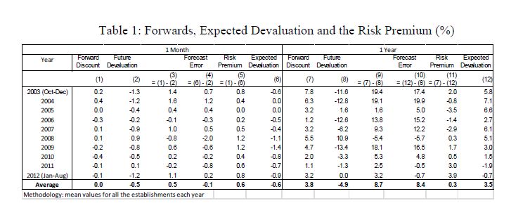 Se utiliza en este documento la Encuesta de Expectativas realizada mensualmente por el Banco de la República entre Octubre de 2003 y Agosto de 2012. Se encuentra que las revaluaciones de la tasa de cambio llevaron a expectativas de nuevas revaluaciones en el corto plazo (1 mes), pero a expectativas de devaluación en el largo plazo (1 año), y que las expectativas son estabilizadoras tanto en el corto como en el largo plazo. La tasa de cambio forward es en general diferente de la tasa spot en el futuro, principalmente pues los errores de pronóstico son en promedio diferentes de zero. Esto sugiere que las expectativas de tasa de cambio no son racionales. El papel del riesgo cambiario también es importante, sin embargo, siendo estadísticamenente significativo a 1 año (no a 1 mes). Las expectativas a 1 mes resultan mejor para predecir que los modelos de expectativas extrapolativas, adaptativas o regresivas, o que la tasa de cambio forward, y todas ellas superan las predicciones de una caminata aleatoria. Pero los resultados a 1 año son prácticamente opuestos. En este caso los traders y analistas pronosticarían mucho mejor utilizando modelos simples o incorporando en sus proyecciones algunas variables conocidas.